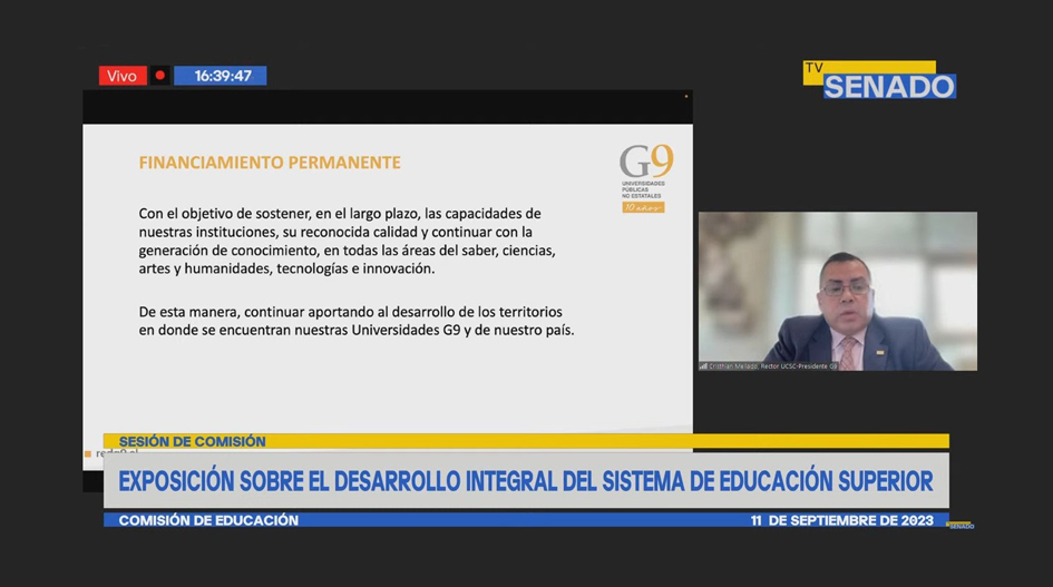 En una sesión híbrida, el Rector Mellado presentó a la Comisión de Educación los diversos aportes al país que realizan las Universidades G9, los impactos en el sistema de educación superior, la situación financiera que afecta a estas instituciones actualmente y las dificultades que se prospectan a mediano y largo plazo. Además, desde la Red G9 se reiteraron propuestas en materia de financiamiento y se insistió en la necesidad de evaluar algunas modificaciones en la Ley de Educación Superior, con el objetivo de asegurar el desarrollo de los proyectos educativos de la agrupación.